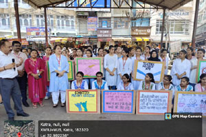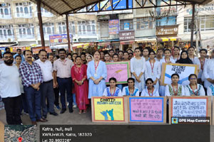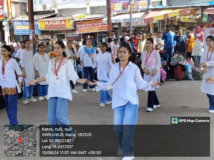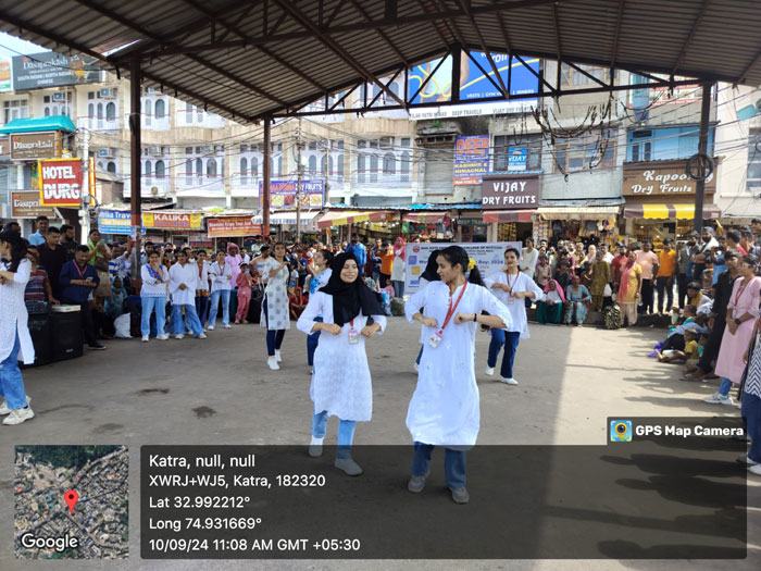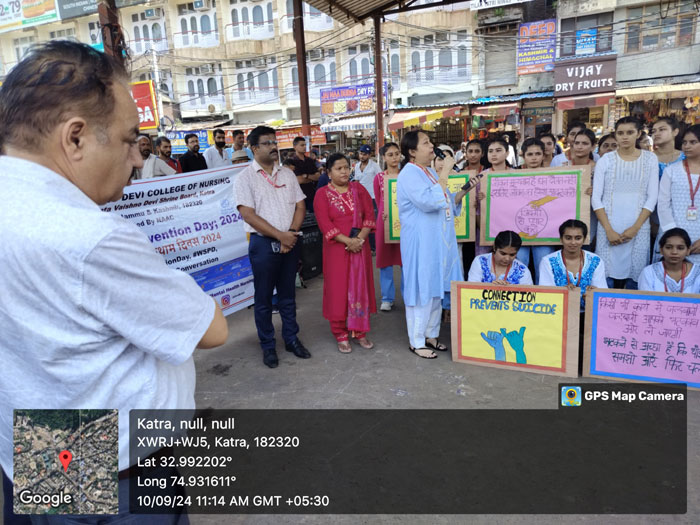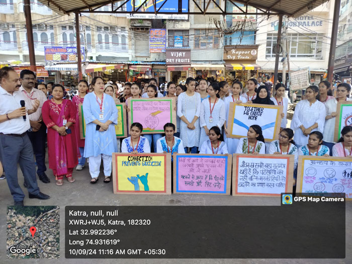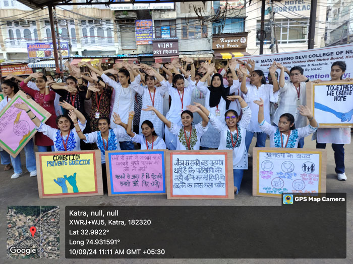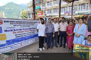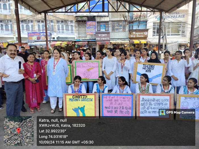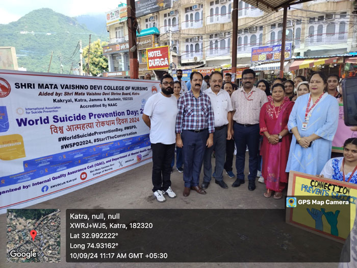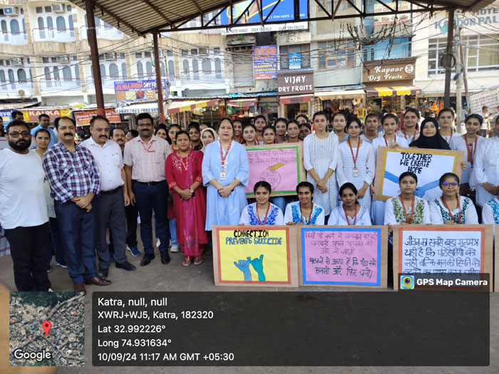 The Shri Mata Vaishno Devi College of Nursing, in collaboration with the IQAC and Mental Health departments, organized a Suicide Prevention Awareness event on 10th September 2024 in Katra, Jammu. The event featured a flash mob dance that attracted a large gathering of the local community. Mr. Dinesh C Anthal Naib Tehsildar, Katra, graced the occasion with his esteem and presence. Furthermore, Principal Dr. Shailla Cannie addressed the audience, highlighting the significance of suicide prevention in the socity